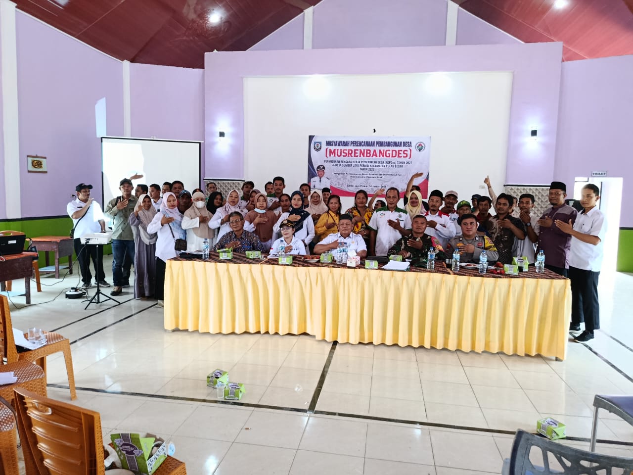 Desa Sumber Jaya Permai Gelar Musrenbangdes dalam rangka penyusunan RKPDes 2027- pada hari ini telah diselenggarakan kegiatan Musyawarah Perencanaan Pembangunan Desa (Musrenbangdes) dalam rangka penyusunan Rencana Kerja Pemerintah Desa (RKPDes) Tahun 2027 pada tanggal 14 Januari 2026. Acara yang bertempat di Balai Kemasyarakatan Desa Sumber Jaya Permai ini dihadiri oleh berbagai unsur penting dari tingkat kecamatan hingga desa. Turut hadir dalam Musrenbangdes, Camat Pulau Besar beserta staf, Danramil 0432/02 Payung, Kapolsek Payung, Kepala UPT Puskesmas Batu Bertumpang, Ketua Badan Permusyawaratan Desa (BPD), Bidan Desa, Kepala Pustu, Ketua Rukun Tetangga (RT), para Ketua Lembaga Kemasyarakatan Desa (LKD), Ketua Dewan Kemakmuran Masjid (DKM), tokoh agama, tokoh masyarakat, serta perwakilan masyarakat lainnya. Kegiatan Musrenbangdes dibagi menjadi dua agenda utama. Sidang Pleno I diawali dengan pemaparan mengenai arah pembangunan desa, kemudian dilanjutkan dengan pembentukan empat kelompok diskusi yang fokus pada tema-tema pembangunan prioritas. Setelah diskusi kelompok, dilaksanakan Sidang Pleno II yang dipimpin oleh Kepala Desa Sumber Jaya Permai, Bapak Toha Maksum, NL. P. Dalam sidang ini, masing-masing perwakilan kelompok mempresentasikan hasil diskusi dan mendapatkan tanggapan dari pimpinan sidang.